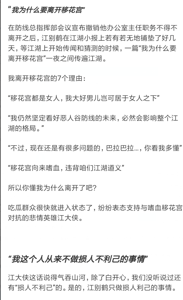 其实太阳底下没有新鲜事,我们来看看江别鹤江大侠的故事。江大侠在前几年频频出入大会,江湖地位扶摇直上,但被审查出收受回扣等问题被撤职后,江大侠是如何给自己铺垫,找个体面的台阶离开移花宫的?