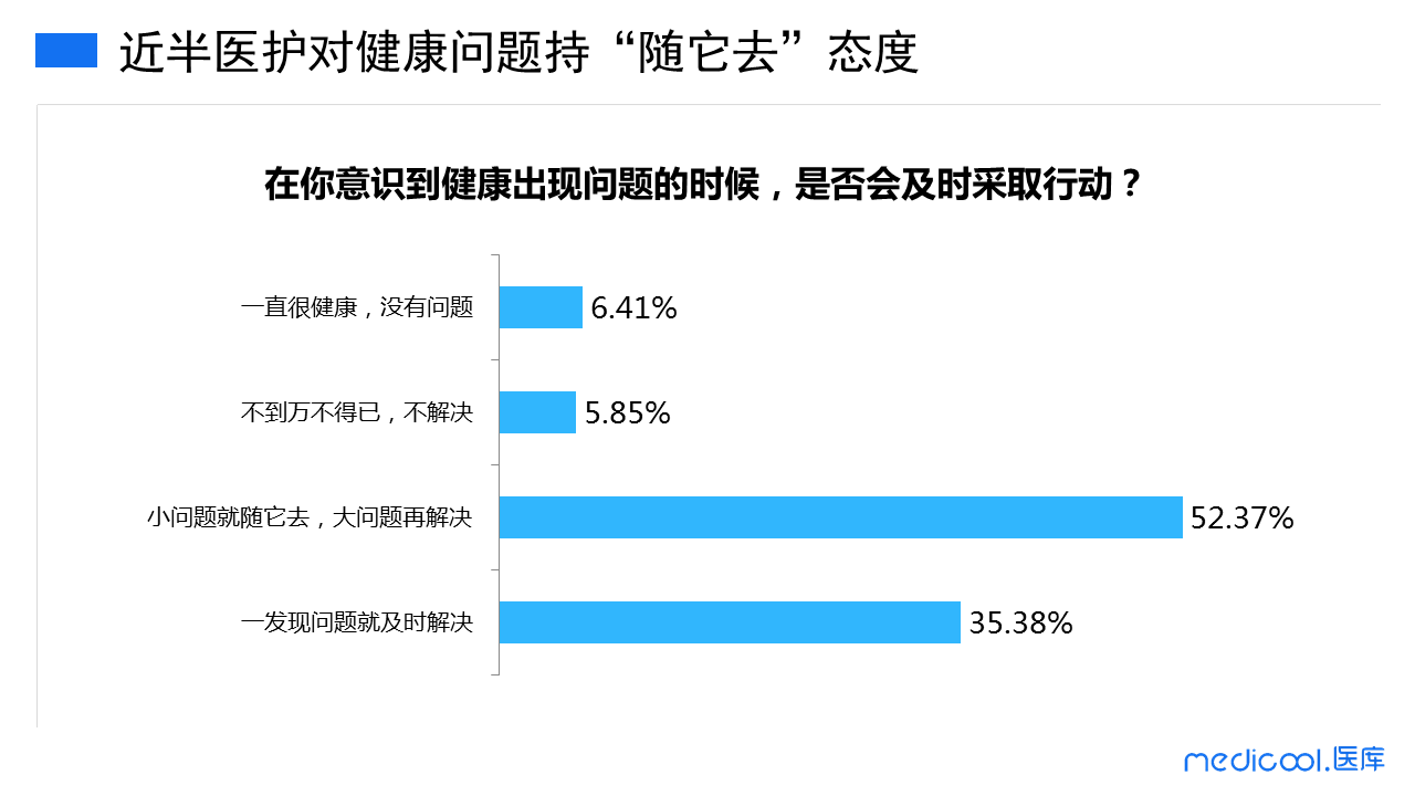 本期调研我们可以看出,发现健康问题立即解决的医护占35.38%,更多的医护是遇到小问题就“随它去”,大问题再着手解决,这或许是基于自身专业的判断,也可能是过于繁忙的工作使他们顾不上去处理那些不影响工作的小问题。
