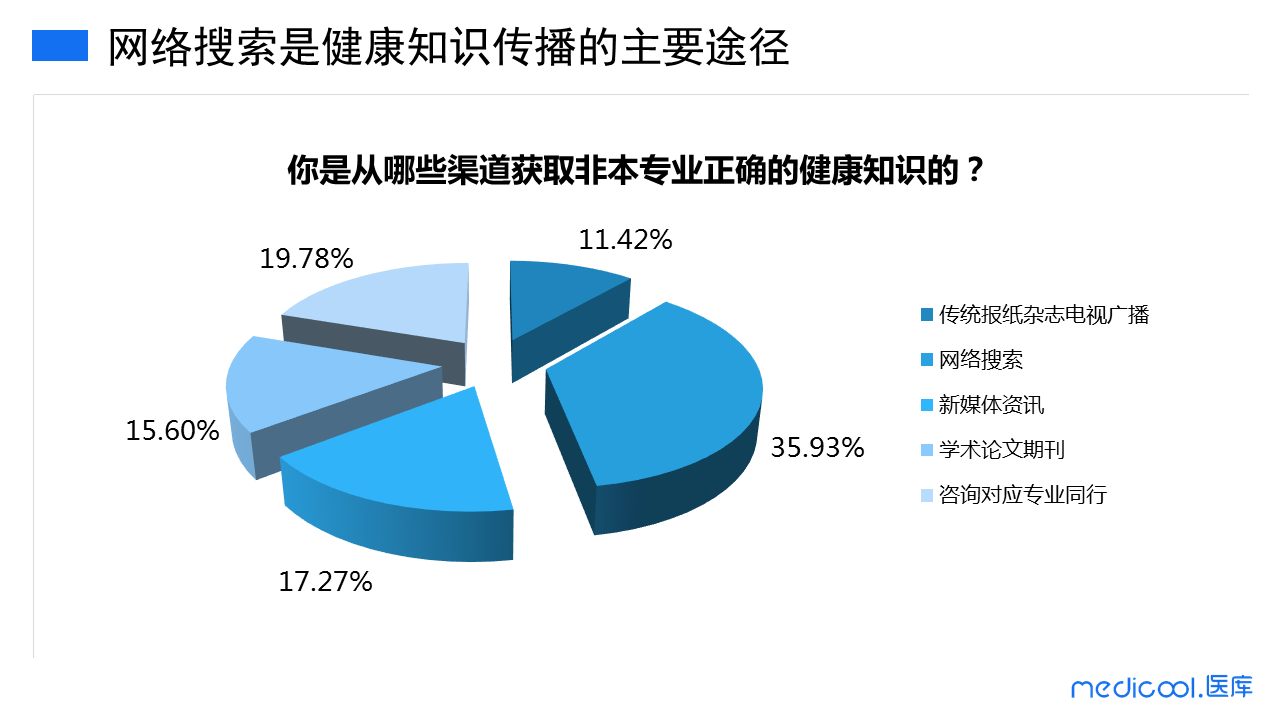调研显示,35.93%的医护选择网络搜索途径,这也是民众遇到健康问题时选择的主流方式,19.78%会向对应专业的同行请教,通过新媒体资讯了解知识的占17.27%,还有15.60%会选择直接查询相关学术期刊,这个途径应该说相当硬核了。