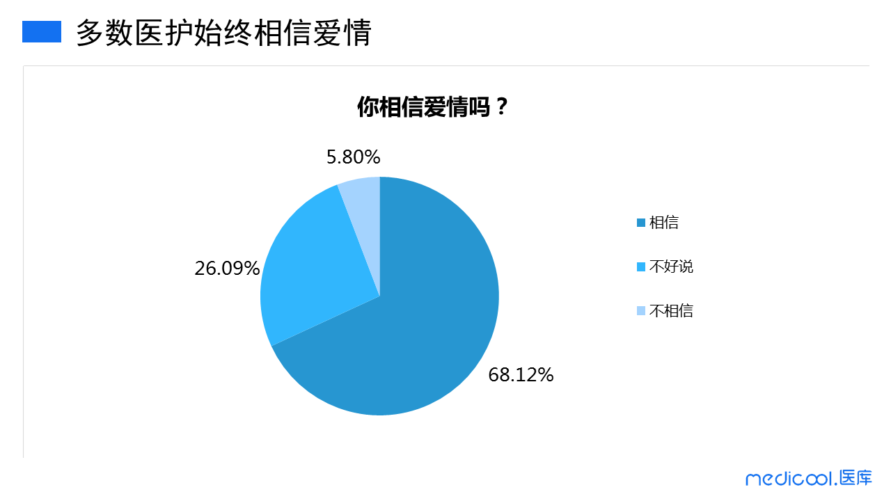 调研的结果告诉我们,不是的,我们始终相信爱情!68.12%的医护毫不犹疑的表示相信爱情。但还有5.8%的少部分医护可能受曾经某段经历的影响,表示不相信爱情。