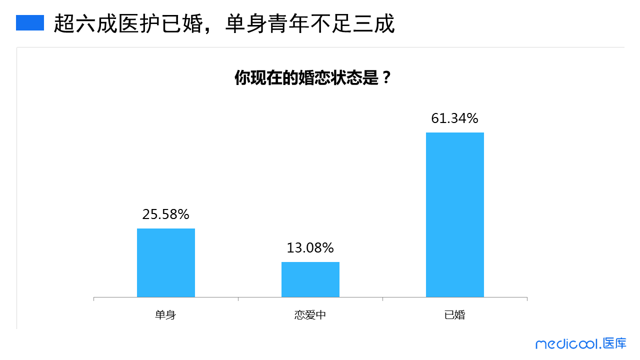 本次调研我们可以发现,超过六成的医护是已婚状态,13.08%的医护是有对象的那一拨,只有25.58%的医护还是单身状态,想必这部分医护年纪都还不大,所以脱单事宜还没提上日程。