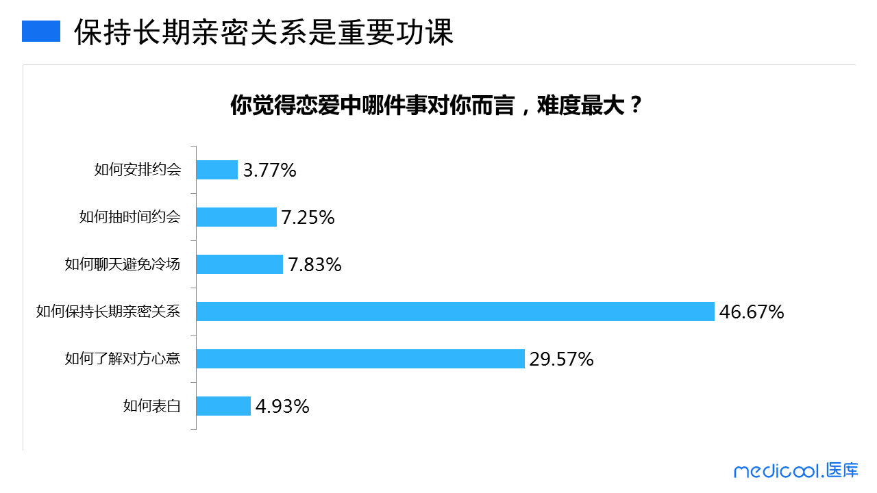 而在恋爱相处中,46.67%的医护觉得保持长期亲密关系是最困难的地方,毕竟各自孤独的两个人要磨合到一起需要时间,需要相互付出和包容;