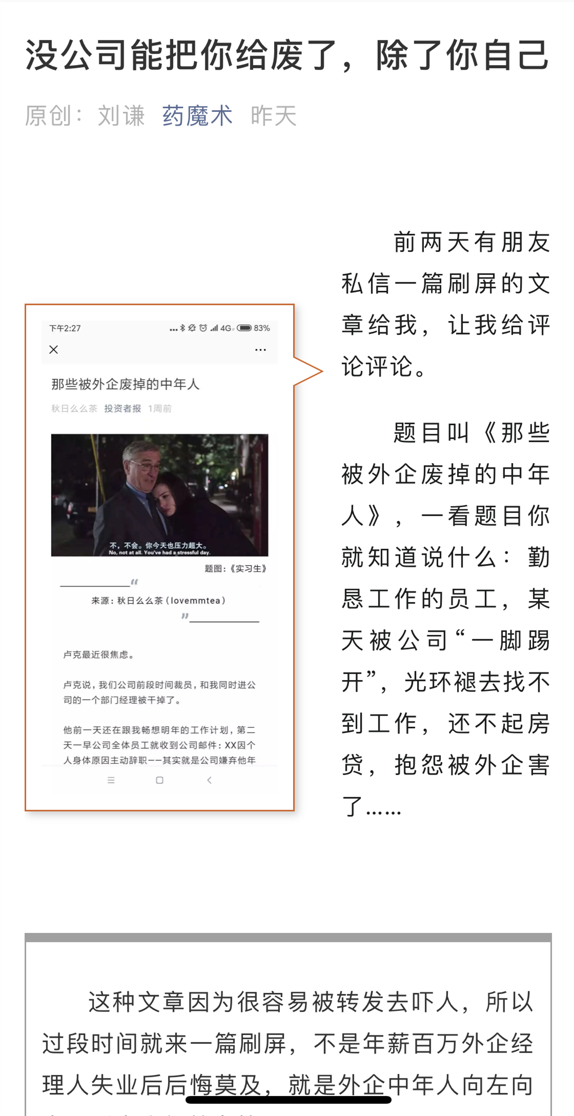 昨天晚上看到谦哥的文章《没有公司能把你给废了,除了你自己》,写出了职场中存在的一些现象,切中要害,针砭时弊。