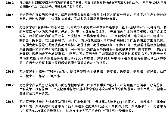 万达信息是国内著名的软件开发和在线营运的领军企业。历经多年发展,万达信息的主营业务主要是集中在2G(针对公用事业)以及2B(针对企业)的应用软件的开发,IT营运服务以及系统集成服务。在技术上,也从传统的盒装软件开发过渡到利用互联网,云计算以及当前的热门的人工智能的开发。从服务的范围来看,则涵盖卫生健康,政务服务,市场监管,民生保障,平安城市,医疗保险及医疗保障,以及云平台运营等领域。