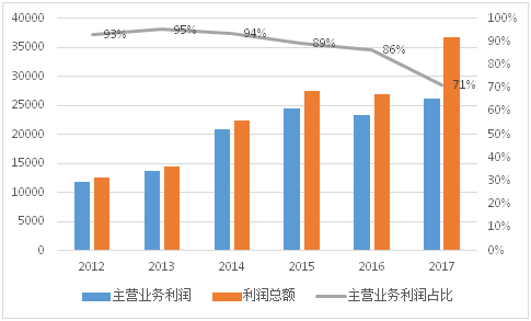 万达信息过去几年主营业务占利润总额的比例如下图所示: