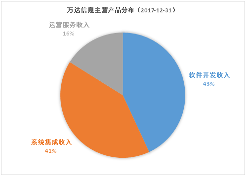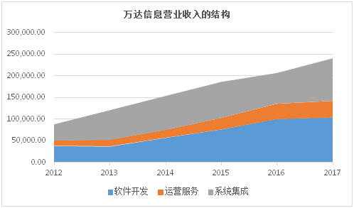 万达信息是一家专业化IT运营服务商,其主要的服务包括软件开发,系统集成以及IT运营服务。2017年,71%的利润总额来自于这三大服务板块。从营业收入的分布来看,系统集成的销售额为9.86亿,占总营业收入的40.83%,较2016年同比增长38.38%;软件开发收入为10.4亿元,占总营业收入的43.09%,较2016年同比增长3.8%;营运服务收入为3.88亿元,占总营业收入的16.08%,较2016年同比增长7.99%。