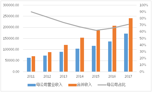 根据2017年财报,万达信息的销售收入为24.15亿元,其中17.17亿由母公司贡献,另外的7个亿则是由合并形成的。我们从过去几年万达信息母公司营业收入占总合并营业收入的比例来看,显然,母公司对合并收入的贡献率从2011年度的90%下滑为2017年的71%,最低为2015年的62%。也就是说,万达信息这几年有大约三分之一的增长来自于近几年的行业整合与并购。如下图所示: