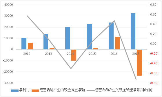 万达信息2017年度税后净利润为3.25亿元,我们将利润表和现金流量表相比较之后发现,万达信息的经营活动现金净流入为-2.34亿元,这就出现了问题, 我们知道如果公司的利润有现金支持的话,其利润是有含金量的, 否则就可能是纸上富贵,质量堪忧。公司的经营活动现金净流入出现负值,很显然经营活动现金的净流入对净利润的支持不足。这可能是公司应收账款时间过长,没有将收入资金回笼。万达信息生意是越做越大,但日子是越过越难,好在万达信息是上市企业,可以不断借债或者增发新股。我们也可以从现金流量表里的“销售商品、提供劳务收到的现金”和营业收入的对比加以证实我们的猜测。通常来说,只要这个比值大于1的话,就能说明该企业经营状况良好,万达信息的比例为0.76,这就印证了我们之前的猜测:公司有大量的款项在应收账款里。造成这样一个情况的原因无非有两个, 一是企业的服务缺乏竞争力,无法先收到货款,还有尾款坏账的风险,二是,其客户的议价能力太强,在国内,这通常是政府机构。