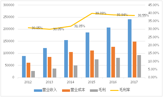 万达信息2017年的销售收入较2016年同比增长16%, 纵观过去数年, 万达信息的营业收入年年增长, 但增长的比例则逐年下调, 这也符合企业成长的规律。