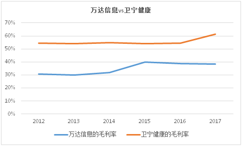 虽然,万达信息的毛利率在2015年大幅提升并维持在一个较高的水平,但和其老对手卫宁健康相比,则还有不小的差距。这也间接说明经营效率还有很大的提升空间。