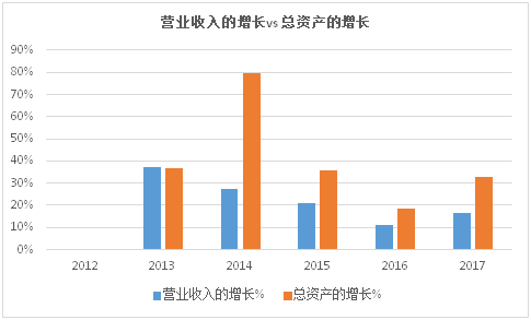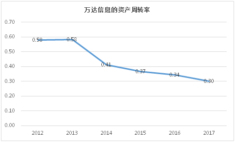 2017年,万达信息营业收入为24亿,总资产为80亿,也就是说万达信息的资产周转率仅为0.3次。资产的增长率(33%)则大幅高于销售的增长率(16%)。纵观过去几年,万达信息的资产周转率不升反降,销售的增长远远赶不上资产的增长。管理效率不升反降。