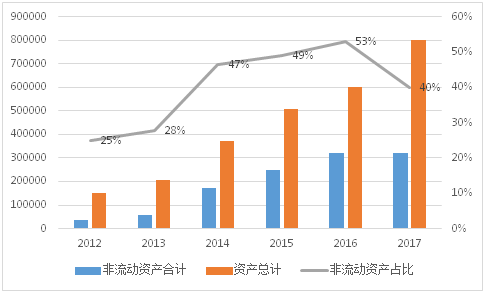 万达信息算是一家轻资产还是重资产的公司呢?资产的轻重其实考量的是其变现的难度,资产越重,其变现难度亦越大。我们从下图可以看到万达信息的非流动资产占比在过去几年都在50%上下。我们常常认为是轻资产的商誉以及无形资产在资产负债表里其实都在非流动资产里。这些资产如果长期都不减值,但又不能产生相应的经济利益,只能说明这些资产的质量堪忧。