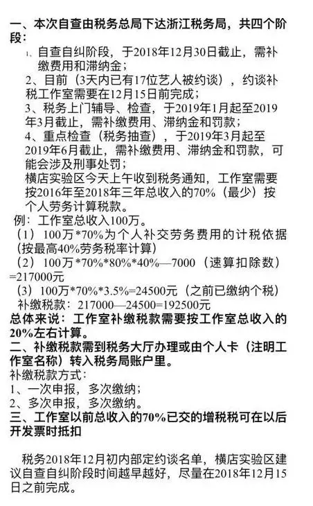 范冰冰税案之后的大震荡终于来袭!前几日,几张有关影视工作室补缴税额相关规定的截图在影视行业从业者的朋友圈大量刷屏。截图称已收到通知,演员、导演、编剧所有影视工作室将按2016年~2018年收入的70%补税,税率在30%左右。截图中还算了一笔账:若工作室总收入为100万元,按此规定则需最低补缴19万元。