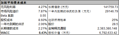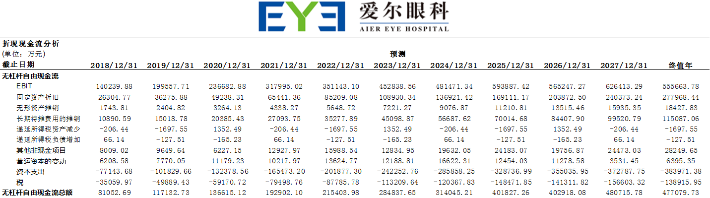 这样,爱尔眼科基于营业收入增长预测估算的股权价值为: 550.6亿元。将股权价值除以完全稀释的流通股数量(2,383,380,148股),就计算出股价为:23.10元/股,比爱尔眼科目前的股价29元左右/股较低。这也说明爱尔眼科的目前的价值并没有被高估。敏感性分析限于篇幅略。
