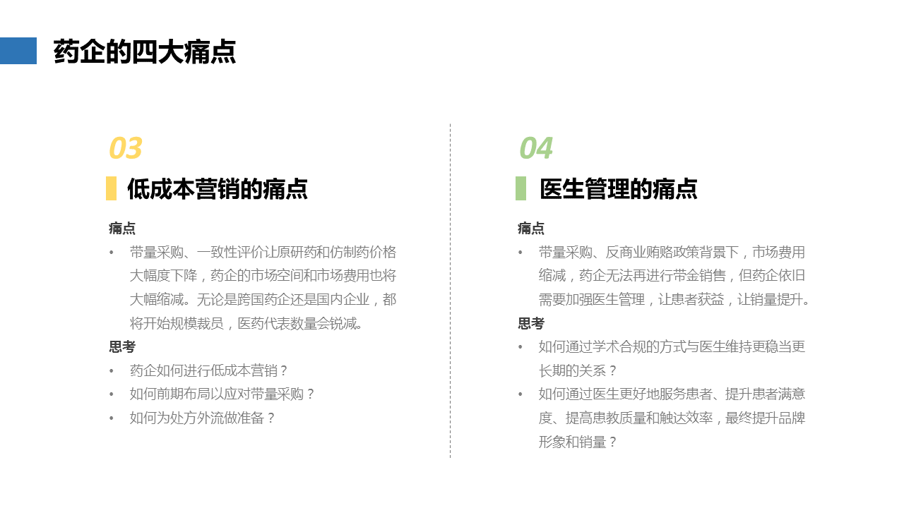 日子就算再难也还是要过,药企现在究竟有哪些痛点?该如何解决问题?Dr.2总结了四点,供医药行业朋友们一起探讨。