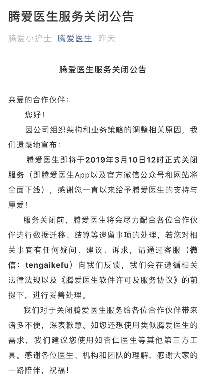 前后历经3年多时间,腾爱医生从“未设定收入目标”走到“因公司组织架构和业务策略的调整相关原因而关闭”的地步,个中经历我们不得而知,真实原因我们也无从知晓,但我们依旧能从这些年腾讯的一些动作和行业发展进程中探索一二。