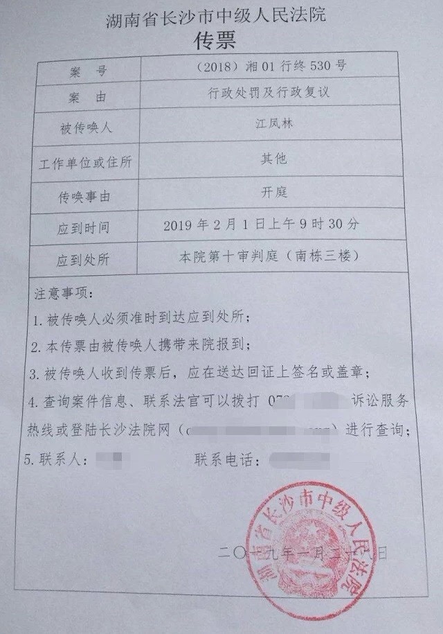 2018年7月16日,江凤林收到长沙市岳麓区人民法院行政判决书,驳回原告(江凤林)的全部诉讼请求,江凤林一审败诉。