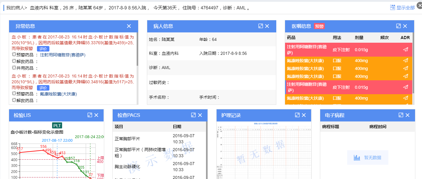 支持查看特定病人的全部信息,包括医嘱、诊断、检查、检验、病程等;