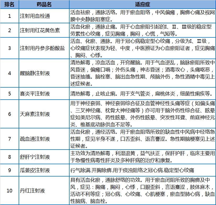 从纳入各省辅助用药名录的适应症来看,纳入名录的中药注射液以心脑血管用药、肿瘤用药为主,其他辅助类以免疫调节、神经营养剂、心脑血管用药为主。尤其是活血化瘀类中药,在排名前十个辅助用药中占了六个。可见各省市都对活血化瘀类中药加强监管,当发现药品疗效不明确而市场销量巨大后,把这类药物列入辅助用药。并很可能推进入选到国家辅助用药目录内。