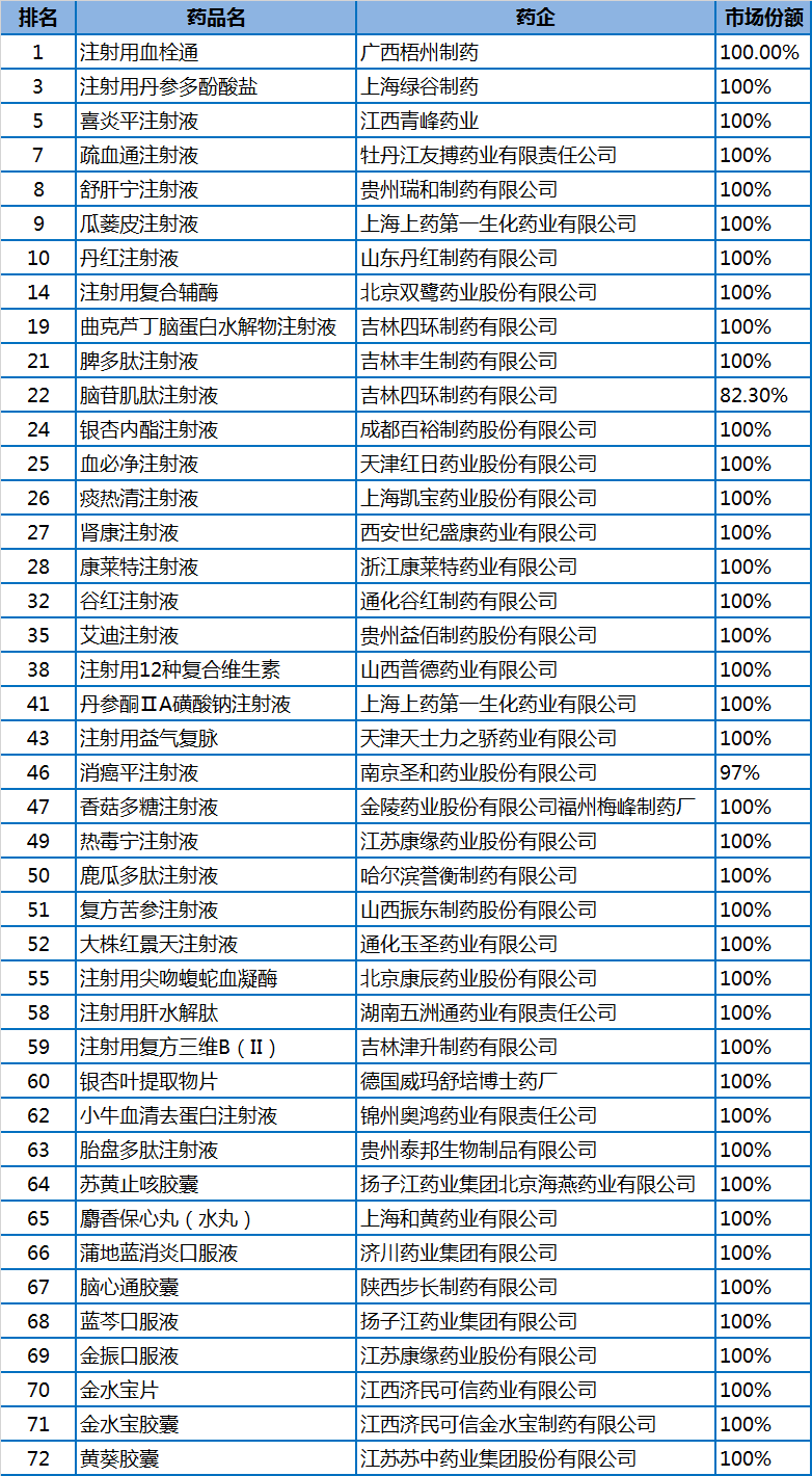 仔细分析这73个品种的市场份额,我们看到,其中42的品种的市场份额是100%或者占到80%以上。也就是这些品种垄断了品种细分市场,尤其是注射用血栓通、丹红注射液、喜炎平注射液等,独占市场年销售额接近50亿,甚至达到79亿元。这么巨大一块市场蛋糕,却没有其他企业一起生产销售瓜分。是技术壁垒无法逾越,还是做大市场的法力高超?