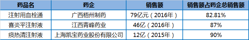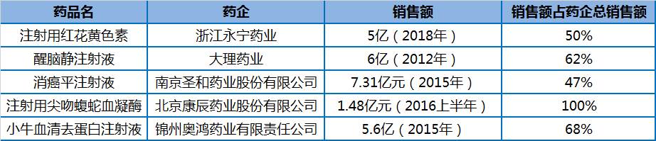 而实际情况也是如此,在上面超过10亿的品种列表中,有些企业的主要市场销售额就来源于这一个辅助用药品种,可以说该品种就是企业的核心产品。如果这些产品列入国家辅助用药目录,那么这类企业的市场将急剧缩减,甚至退出市场。这类产品和企业有:广西梧州制药的注射用血栓通,江西青峰药业的喜炎平注射液,上海凯宝药业的痰热清注射液。