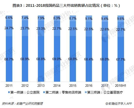 根据目前医药市场的特征,我们可以将药品的销售终端分为三个,分别为:公立医院、零售药店(实体药店和网上药店),以及公立基层医疗。据统计,2018年上半年,我国公立医院终端市场份额占比67.7%,零售药店终端占比22.7%,公立基层医疗终端占比为9.6%。(数据来源:前瞻产业研究院)