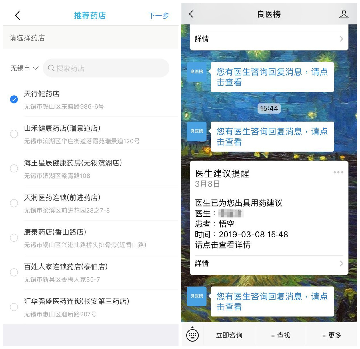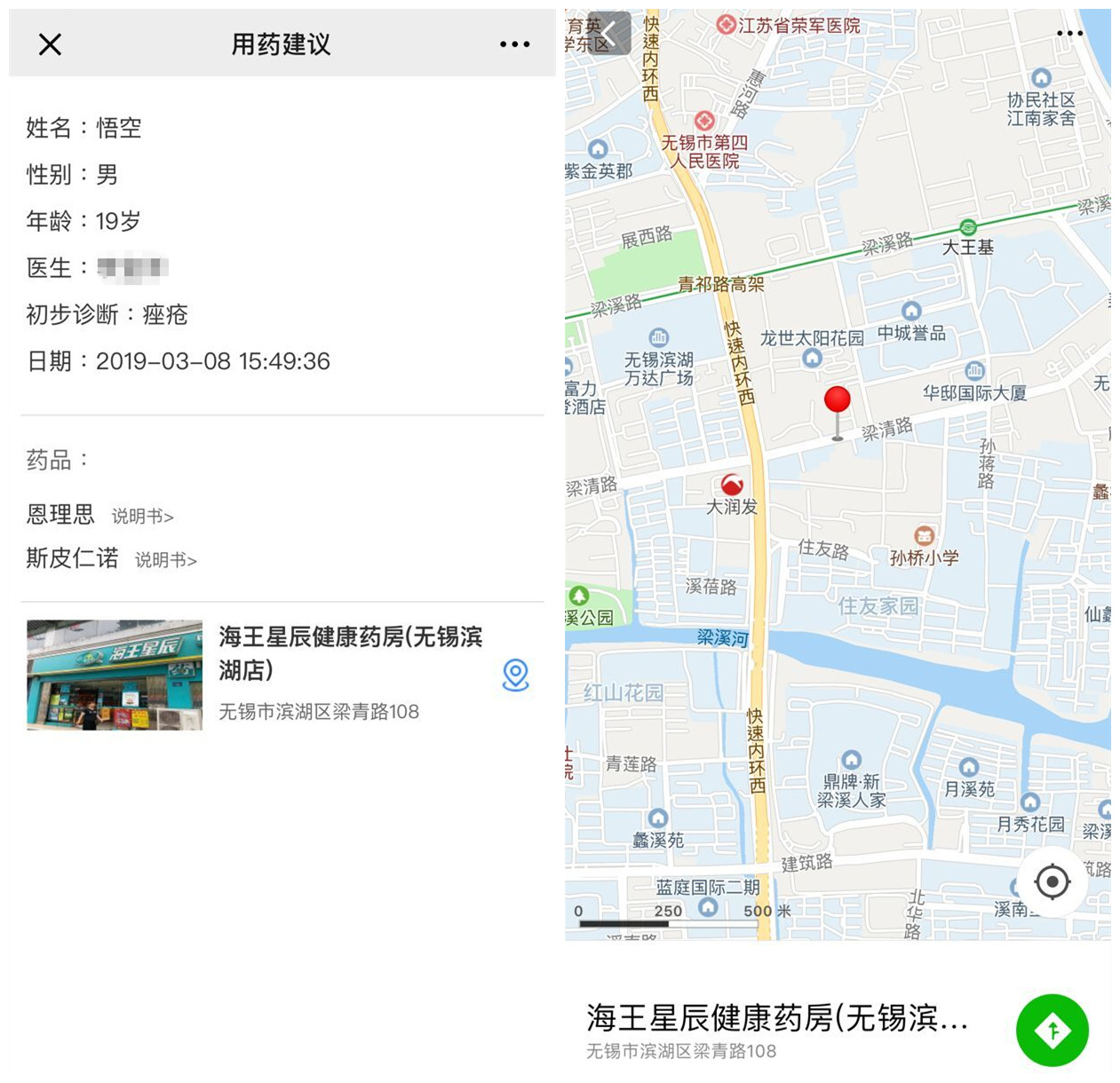 2. 医生通过医库APP在线与患者交流,开具用药建议并选择就近及长期合作的药房后,将用药建议和药店地址推送给患者。患者通过电子的用药建议单去医生推荐的药店购买药品,处方以及最后的药师审核由药店自行完成。