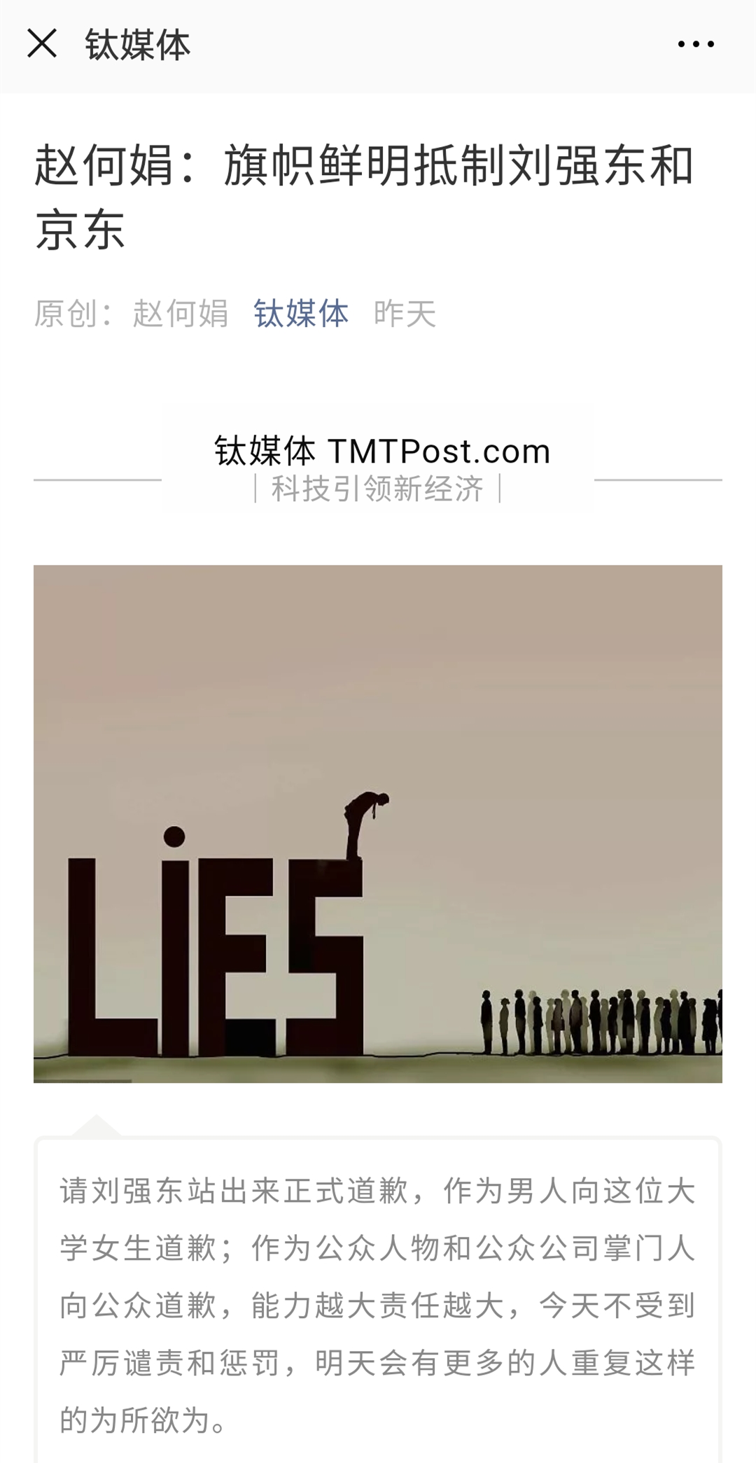 4月21日,钛媒体创始人赵何娟撰文《旗帜鲜明抵制刘强东和京东》表示:“我希望尽自己的一份力,为这个依然弱肉强食的世界公道发一份声,请刘强东站出来正式道歉,作为男人向这位大学女生道歉;作为公众人物和公众公司掌门人向公众道歉,能力越大责任越大,今天不受到严厉谴责和惩罚,明天会有更多的人重复这样的为所欲。