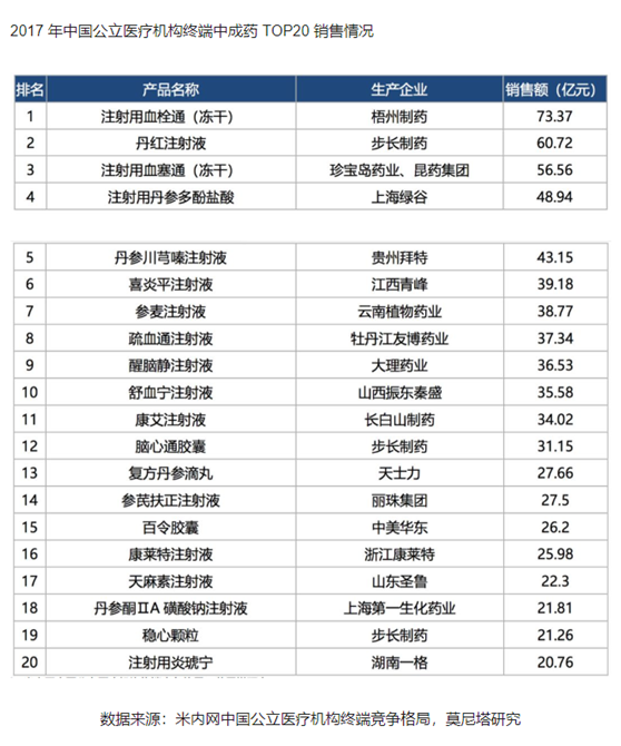 根据2017年公立医院中成药的销售情况,排名前20的中成药中,16个为注射液,主要的上市企业有中恒集团(梧州制药)、步长制药、昆药集团、振东制药、丽珠集团、大理药业等。