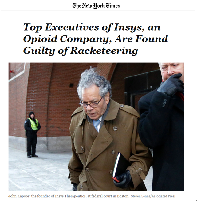 2017年10月,Insys创始人John N. Kapoor在亚利桑那州被捕并被指控犯有RICO阴谋。