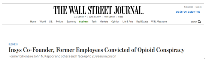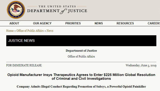 今年五月,美国马萨诸塞州联邦检察院对Insys及其运营子公司提起诉讼,指控其五项欺诈罪名。五名Insys前高管因涉嫌参与Subsys的营销而被判犯有敲诈勒索罪。目前,共有八名公司高管在波士顿因非法销售Subsys而被定罪。