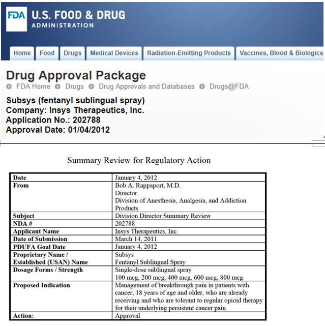 无论是刑事调查还是民事调查,都因Insys支付回扣以及其他与销售Subsys相关的非法营销行为,及其产生的严重后果。2012年,美国食品和药物管理局(FDA)批准Subsys用于治疗突发性疼痛的癌症患者。但该制药厂商贿赂医生,让他们向无需服用此药的患者开处方或者对没有癌症的病患也开了Subsys的处方。