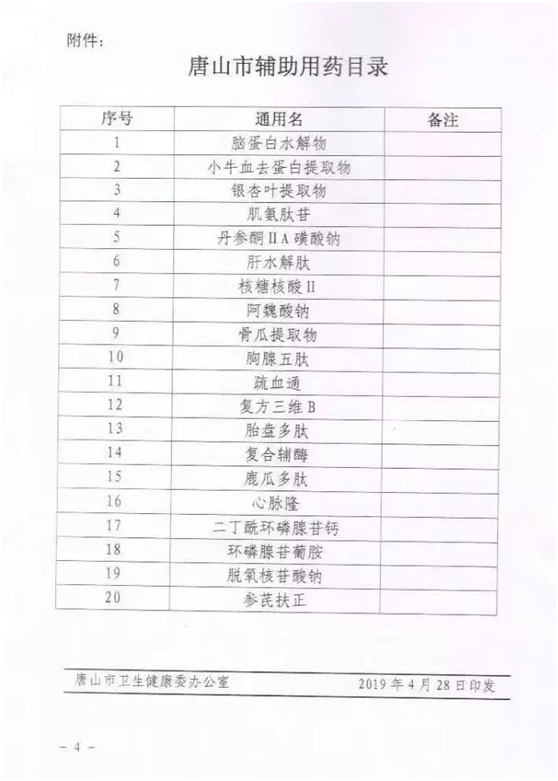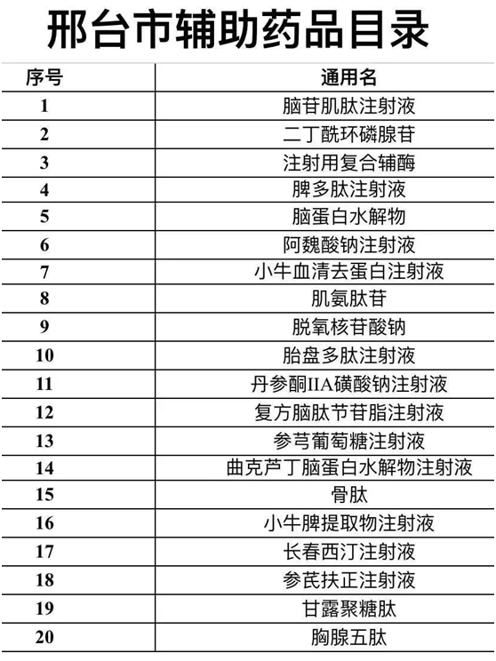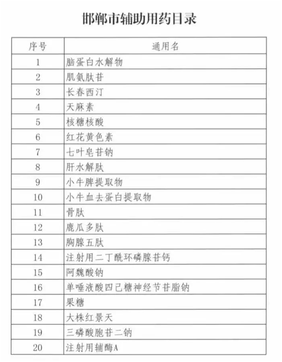 而有一些城市已经完成了辅助用药的上报,例如河北6市辅助用药目录已公布,邢台、邯郸、秦皇岛、保定、唐山、石家庄,各目录均有辅助用药20个,我们可以看一下列表: