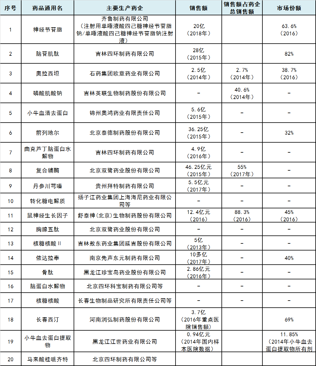 (主要生产企业、销售额、销售额占药企总销售额、市场份额数据取自网络公开数据)