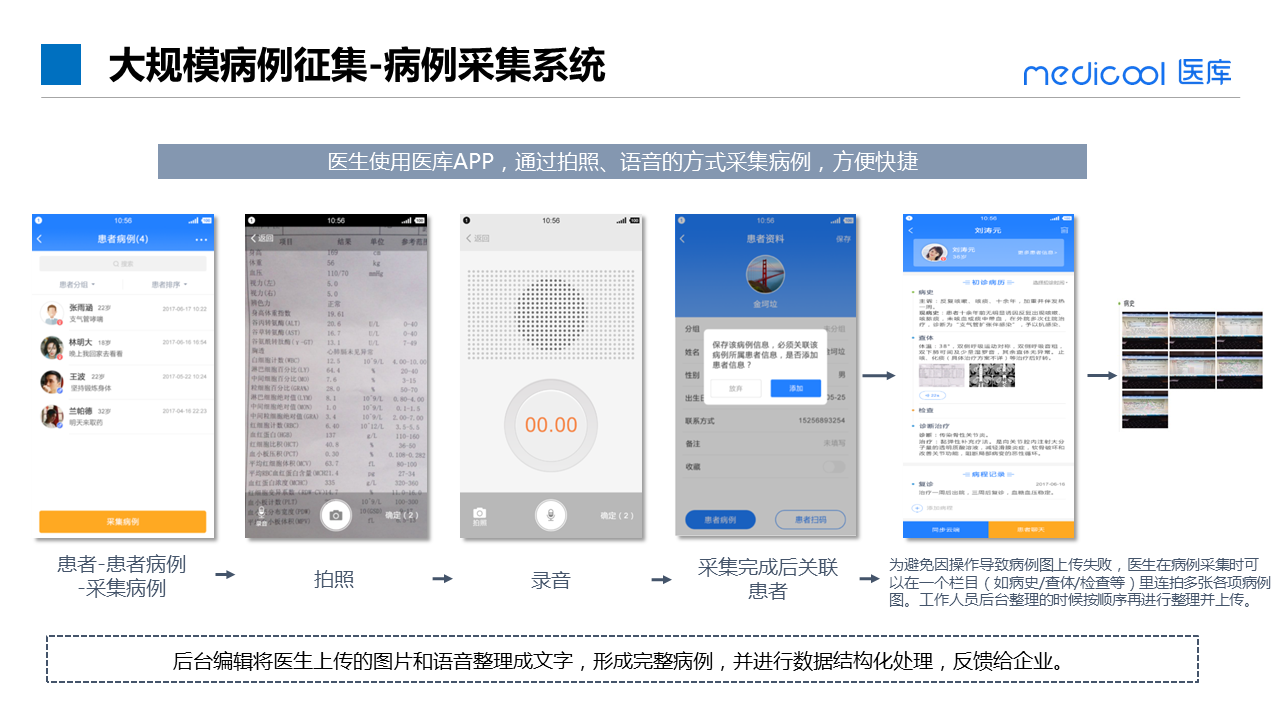 具体执行,超大规模病例征集,可以采用基于移动互联网的创新技术方式,不需要去填表格,病例采集用拍照和语音的方式,上传、用户管理和数据分析整理均由后台完成,既不需要消耗医生的时间,也不需要消耗药企的人力,这使得病例征集活动化繁为简,更易被医生接受。通过线上线下有效互补的方式,减少人力成本消耗的同时,扩大活动覆盖范围,提高效率,快速传递活动信息,收集真实有效的病例。