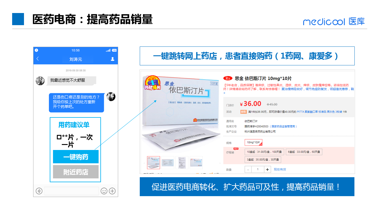 闭环的医药电商、院外药店零售可以直接促进药品销售量。由医生向患者出具处方会诊意见,或者用药建议单,或之前的用药一键续方,患者可以选择医药电商平台进行购药,或者推送附近的合作药店,提升药品可及性。
