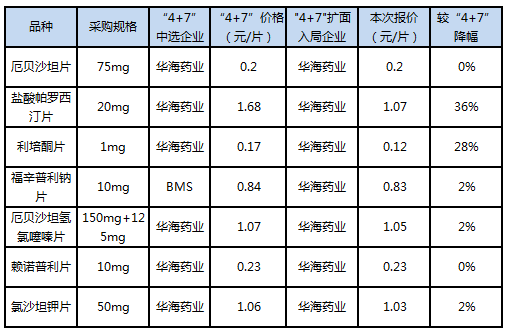 与首轮集中采购时相同,华海药业再次成为最大赢家。华海药业此次参与集采竞标的厄贝沙坦片、氯沙坦钾片、厄贝沙坦氢氯噻嗪片、赖诺普利片、盐酸帕罗西汀片、利培酮片、福辛普利钠片七个品种全部中标,而且除了盐酸帕罗西汀片和利培酮片之外,其他中标品种几乎没有降价。