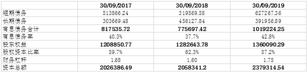 从表2-1中可以看出, 科伦药业在2019年9月30日的有息债务率为42.8%,股权资本比率为57.2%。从过去3年的趋势来看, 债务有明显上升, 财务杠杆为1.75。从资本的期限来看, 短期资本占比为26%, 长期资本占比为78%。