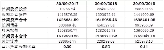 截止于2019年9月30日,科伦药业的营运资本较去年同期大幅上升129%。公司长期资本在满足长期资产资金需求之后, 占营运资本的比重很小,