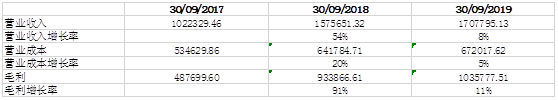 如表4-1所示,截止于2019年9月30日的过去12个月, 科伦药业创造了171亿的营业收入,