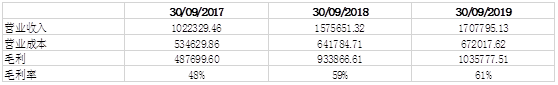 另外一个费用率增加较明显的是研发费用率。这是由于公司的战略的改变, 推进以研发创新为驱动的战略,致使研发费用占比上升。截止于2019年9月30日的过去12个月, 科伦药业的总费用率为52%。