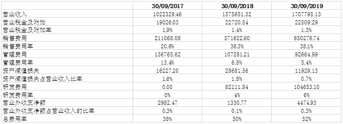 我们看到公司在过去三年,营业税金和附加率, 管理费用率,资产减值损失率都有所下降,然而销售费用率则在大幅上升,主要原因公司解释为“两票制”政策深入贯彻,以及创新产品陆续上市,公司加强市场开发、维护、管理、学术推广力度,致使销售费用大幅增加。