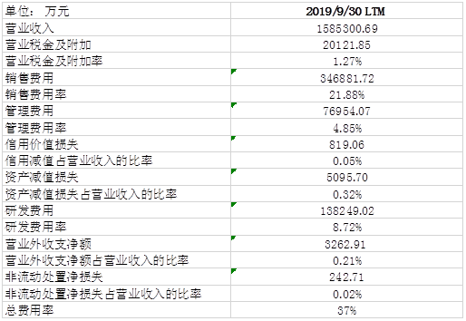 截止于2019年9月30日的过去12个月,迈瑞医疗的总费用率为37%。同样,我们无法获得更多历史数据, 无法分析公司营业费用的趋势。