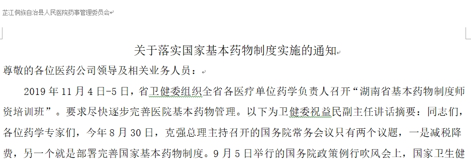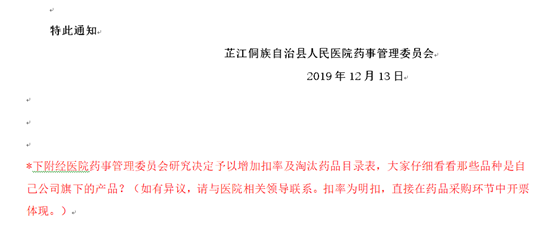 2019年12月中旬湖南芷江侗族自治县人民医院药事管理委员会向医药公司发布了《关于落实国家基本药物制度实施的通知》,该《通知》下附经医院药事管理委员会研究决定予以增加扣率及淘汰药品目录表,扣率为明扣,直接在药品采购环节中开票体现。