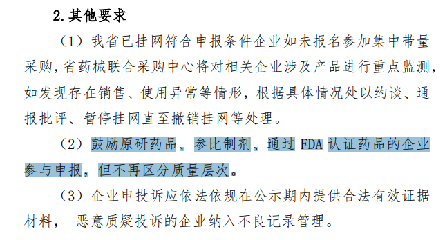 其中,对于申报的资质要求之一是:属2018 年 7 月 1 日至 2019 年 6 月 30 日申报品种在福建省同品种仿制药(不含参比制剂、通过 FDA 认证且在欧美有销售的仿制 药,以采购目录归并通用名剂型为准)平台采购数量排名前3名的企业(不同规格产品采购量合并计算,以省药械采购平台入库 数量为准)。另一项要求是:鼓励原研药品、参比制剂、通过FDA认证药品的企业参与申报,但不再区分质量层次。可见,在福建的这次集采中,通过一致性评价不再作为硬性要求。集采扩大至未通过一致性评价的品种,这是一种新的趋势吗?实际,在去年河北省和江西省的集采中,也确定了未过一致性评价的药品如果符合要求,可以确认拟中选。