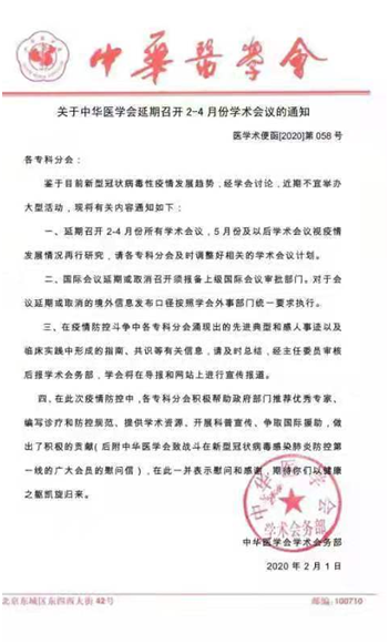 一、 延期召开2-4月份所有学术会议,5月份及以后的学术会议视疫情发展情况再行研究。请各专科分会及时调整好相关的学术会议计划。