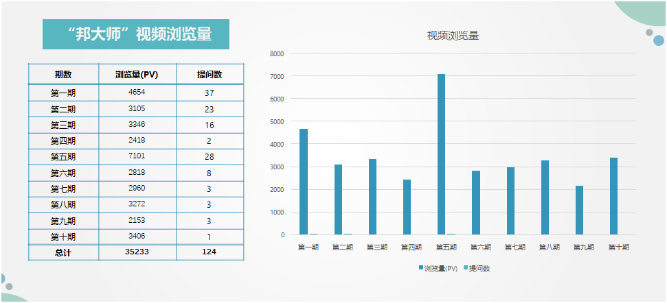 以上是推广数据。到了具体每一专家讲堂视频的效果,有多少人看了,多少人提问,以下是视频浏览数据。