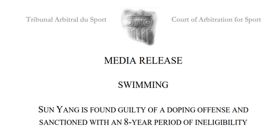 2020年2月28日,CAS(国际体育仲裁法庭)对外宣布听证会的判决结果,孙杨被禁赛八年,判决理由为孙杨违反了《国际泳联兴奋剂管控规则》第2.5条“干预兴奋剂管控”,判决即日起生效;判决同时指,由于有争议的检测之前和之后的测试结果均为阴性,且没有证据表明2018年9月之后孙杨服用禁药,因此不会取消之前的比赛成绩。