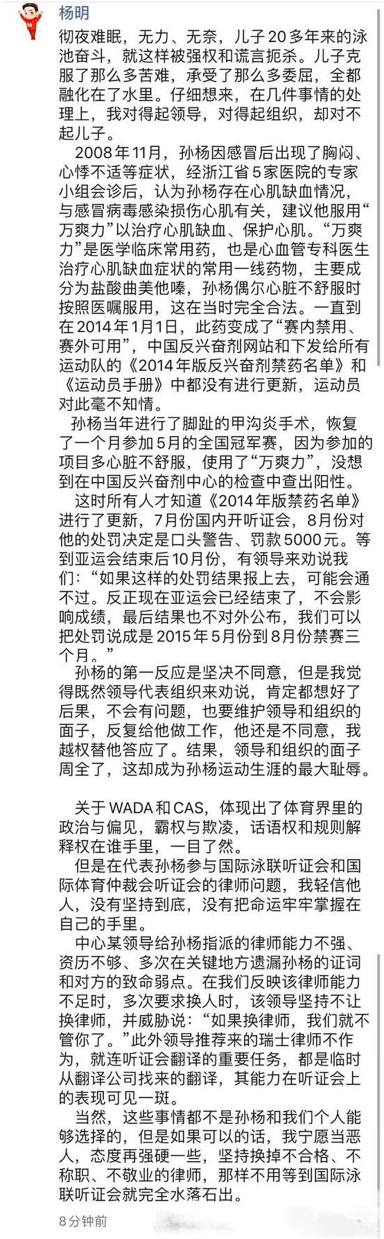 1、详细描述了如何与组织领导弄了个虚假禁赛,欺上瞒下以逃避国际反兴奋剂组织的调查。孙杨母亲说,2014年兴奋剂事件,本来领导只准备罚款5000加口头警告的,但是领导怕处罚太轻上报国际反兴奋剂组织不通过,所以弄了个虚假禁赛。把禁赛日期定在5-17号到8月16号。同时,为了让孙杨顺利参加9月份的仁川亚运会,把事情隐瞒到11月仁川亚运会都结束了才上报。这样护子心切的言论,实际是向外界展示了中国体育界是如何操纵、欺骗、谎报服用禁药!是如何制作体育界的惊天丑闻!开始,运动员和运动员家属以不知更新禁药名单为由,堂而皇之的给涉事运动员服禁药。其后,处罚和欺骗的决定,都经过涉事运动员、家属和领导的共同决定才上报。可见对于服用禁药,可以自己定性自己量刑,公然暴露运动员和家属可以干涉反兴奋剂机构工作。这就足够在体育圈造成极其恶劣的影响,中国体育界从此摆脱不了操纵兴奋剂合法磕药的恶名。因为自己的愚蠢、鲁莽、无知欠全中国人民一个道歉。孙杨此前有很多所谓的爱国言论,例如你可以不尊重我,但是你不能不尊重中国之类的豪言壮语。其实运动员是独立的个体,刻意将自己与国家绑在了一起,获得舆论的支持,来掩盖自身的问题,并不是真正爱国!禁赛八年的判决结果,让这个母亲鱼死网破,不惜一切代价,痛快痛快嘴,也要试图挽回儿子的尊严。2、文中还提到了盐酸曲美他嗪片(万爽力),该药在反兴奋剂禁药名单中。孙杨母亲称,孙杨存在心肌缺血的情况,医生专家建议服用此药,以治疗心肌缺血、保护心肌。曲美他嗪属于赛内禁用的特定物质,2014年1月被列入世界反兴奋剂机构(WADA)赛内禁用。那么无论是队医还是反兴奋剂专业人士,你都应当或必须应当知道,如果不知道,那你是干什么吃的?如果知道,刻意服用就是明知故犯,恶意违规,不明白有什么好解释的呢?你当时的成绩是不是就有服用禁药所带来的获益呢?这跟是不是中国人没关系,难道祖国的荣誉靠服用禁药吗?从医学角度看,含有曲美他嗪的药物在临床上是预防心绞痛的处方类药物,可以提高心肌细胞能量,改善心脏功能。