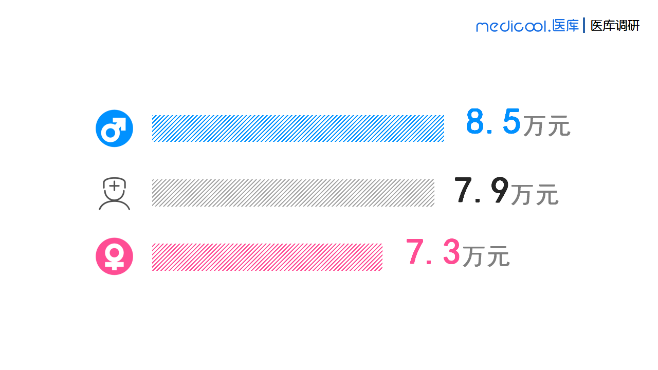 2019年医生的平均收入是7.9万元,而2018年医生的平均收入是7.1万元,相比2018年平均收入有所提升,但增幅并不大。另外,我们发现,男医生比女医生的整体年薪高1.2万元。